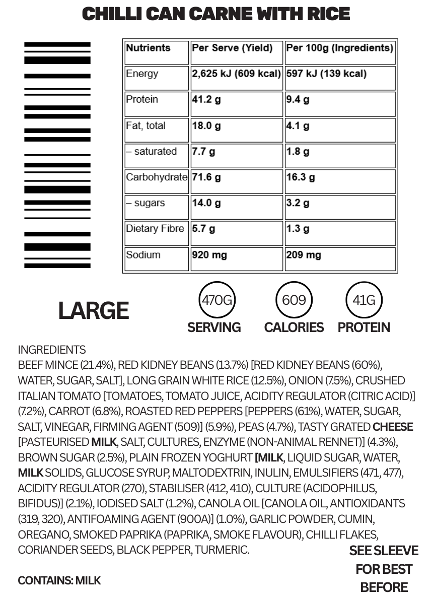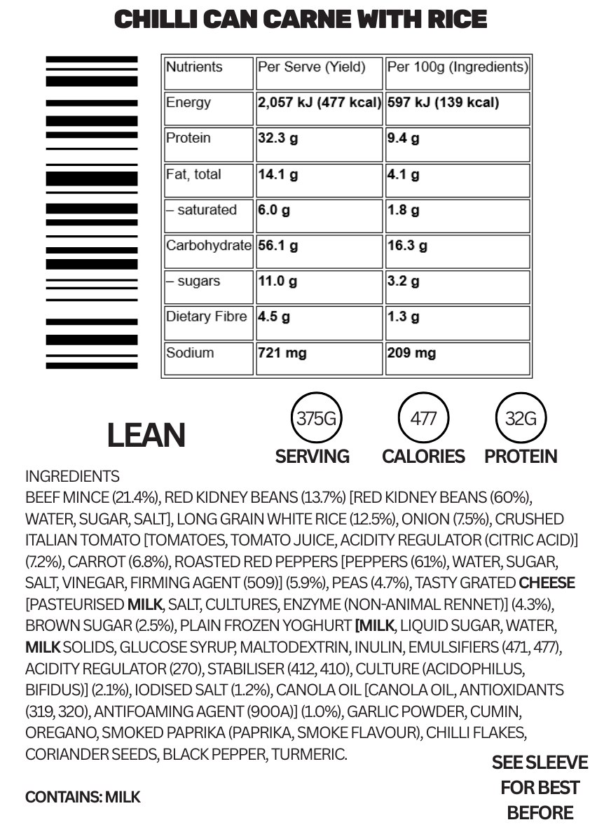 $0.00A classic, high-protein, low-calorie Chilli con carne featuring lean beef chilli seasoned to perfection with rice to absorb that delicious flavour. A satisfying heat-and-eat meal for a nutritious and delicious bite.